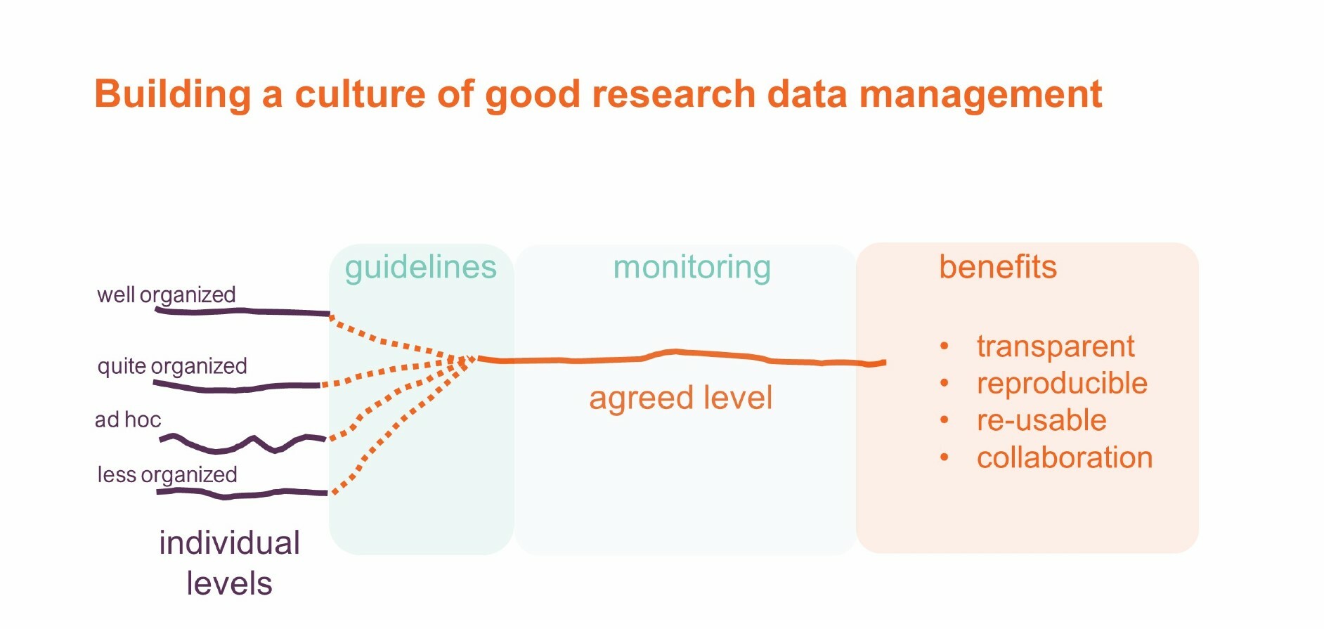 But the rest depends on each lab. “Building a culture of good data management starts with understanding that you have people with different levels of being organized, and you need guidelines to help bring all of them to an agreed level of archiving, while also monitoring them over time to see if they keep using those. And the benefits are manifold: transparent, reproducible, re-usable, collaboration. The result is a large data collection that can be used either in the country or internationally” she explains.