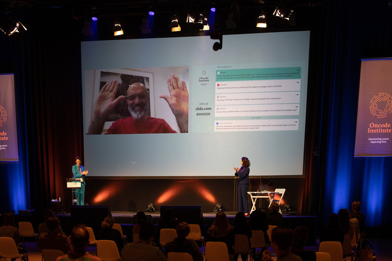 We closed the two days with an impressive keynote lecture. Given the hybrid setting, we were happy and honoured to have Dr. Vishva M. Dixit, who is Vice President of Physiological Chemistry at Genentech and member of Oncode’s International Advisory Board join us from the United States. In his lecture, he discussed his personal journey in attempting to decipher death receptor induced apoptosis and how this unexpectedly led him to studying of the inflammasome and our ability to define an entirely new pathway to inflammatory cell death. This work has important therapeutic ramifications for sepsis, cancer and autoimmune disorders.