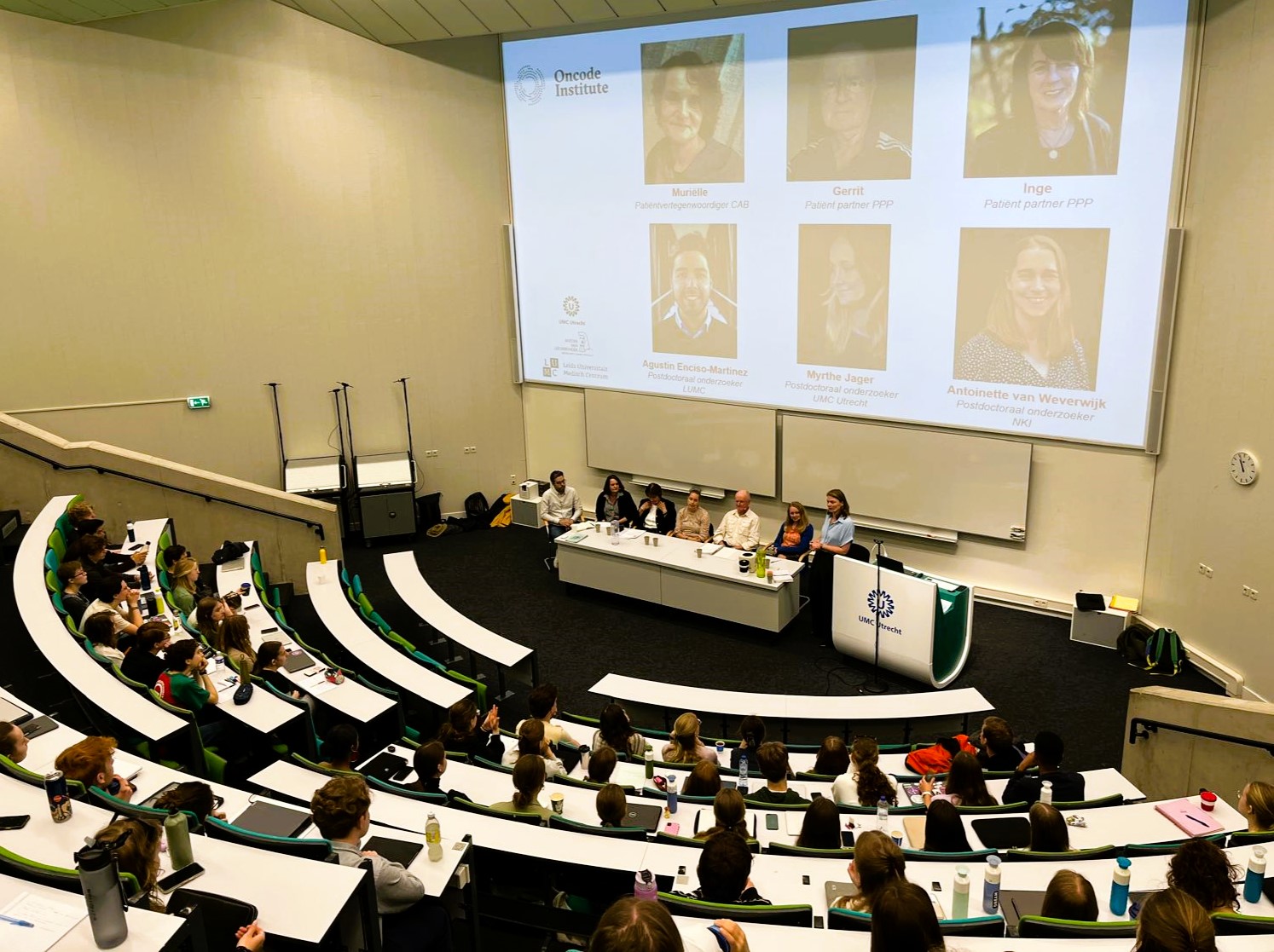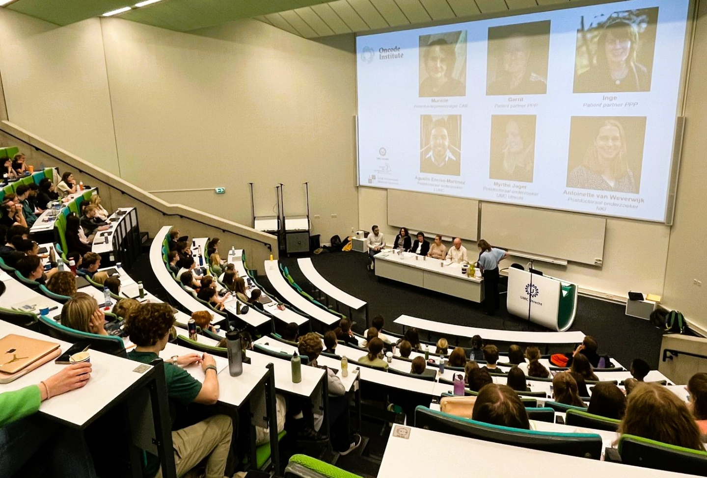 In a comprehensive lecture delivered by Oncode’s Program Manager, Colette ten Hove, students gained valuable insights into the synergy between patients and researchers. They experienced this collaboration firsthand during a dynamic panel discussion moderated by Sevgi Fruytier from the Athena Institute at VU Amsterdam. During this session, patient representatives Inge Reus, Muriëlle Sark, and Gerrit Oostenveld captivated the audience with their heartfelt stories of diagnosis, treatment, and their current roles within the Oncode Patient Perspective Programme. Their openness and honesty provided a profound sense of reality, reminding students of the ultimate goal of their research: improving patients' lives.