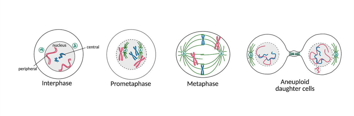 In search of what distinguishes chromosomes that are more likely to mis-segregate than others, no clear relationship regarding structural features of chromosome were found, such as centromere size or length of the chromosome arms. However, the team found a robust correlation between the 3D location of chromosomes and the chance of mis-segregation. Chromosomes that are generally more peripherally located (red in figure 1) near the nuclear membrane were more prone to be mis-segregated than chromosomes that reside in the center of the nucleus (blue in figure 1).