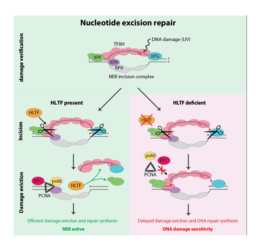 After damage recognition by the NER pathway occurs, the damaged DNA is cut out by nucleases. The regulatory mechanisms that drive NER through its successive damage recognition, verification, incision and gap restoration reaction steps remained thus far largely elusive. In this new study, Marteijn and his team have identified that HLTF, a protein commonly mutated in cancers, is responsible for the active eviction of the incised, but not yet removed, damaged DNA together with associated repair proteins. This represents an additional quality control step by coordinating the transition between the excision and DNA synthesis steps to safeguard genome integrity.