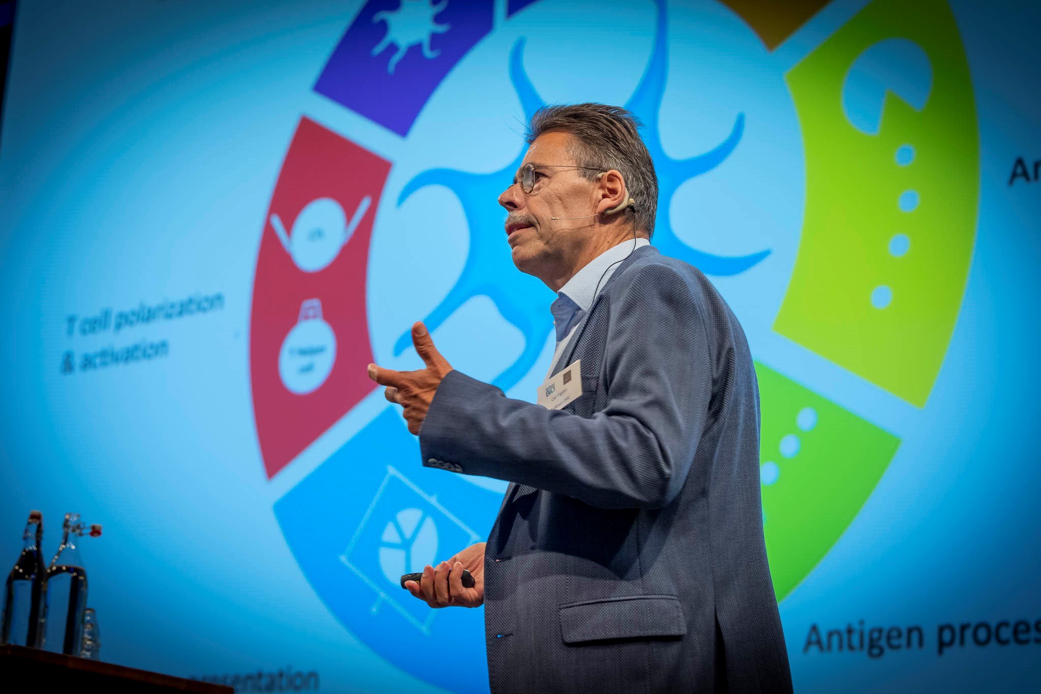 After the break, Oncode Investigator Carl Figdor (Radboud University Medical Center) discussed the limitations of cellular immunotherapies and posed the question whether we can design synthetic ‘off-the-shelf’ solutions for immunotherapy. Food for thought from Carl’s side: Is it possible to skip dendritic cells and immediately activate T-cells?