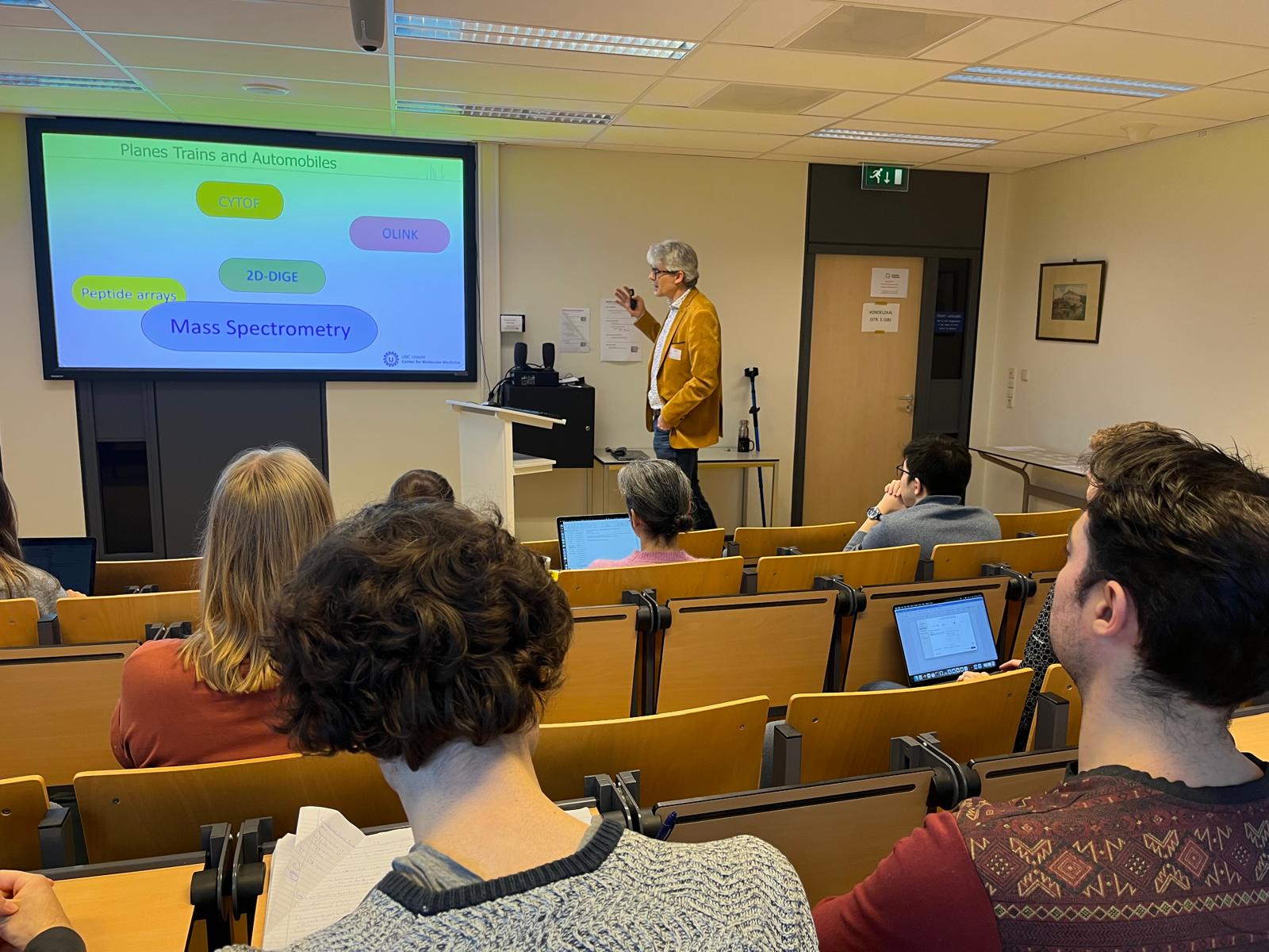 Harmjan Vos kicked off the day with an introduction to mass spectrometry-based proteomics, covering key principles, instrumentation and modern data acquisition techniques. Erwin Schoof followed with insights into single-cell proteomics for blood cell lineage development. Suzan Stelloo showcased proximity biotinylation technologies in chromatin biology, while Charlotte van Gelder demonstrated the use of single-cell proteomics in 3D gastruloid structures. Sebastiaan van Heesch explored the dark proteome in immunopeptidomics, and Jeroen Demmers highlighted the relevance of targeted LC-MS/MS approaches in gene regulation and neurodevelopment. The session closed with Jeroen Krijgsveld’s talk on nascent proteome analysis in cancer research.
