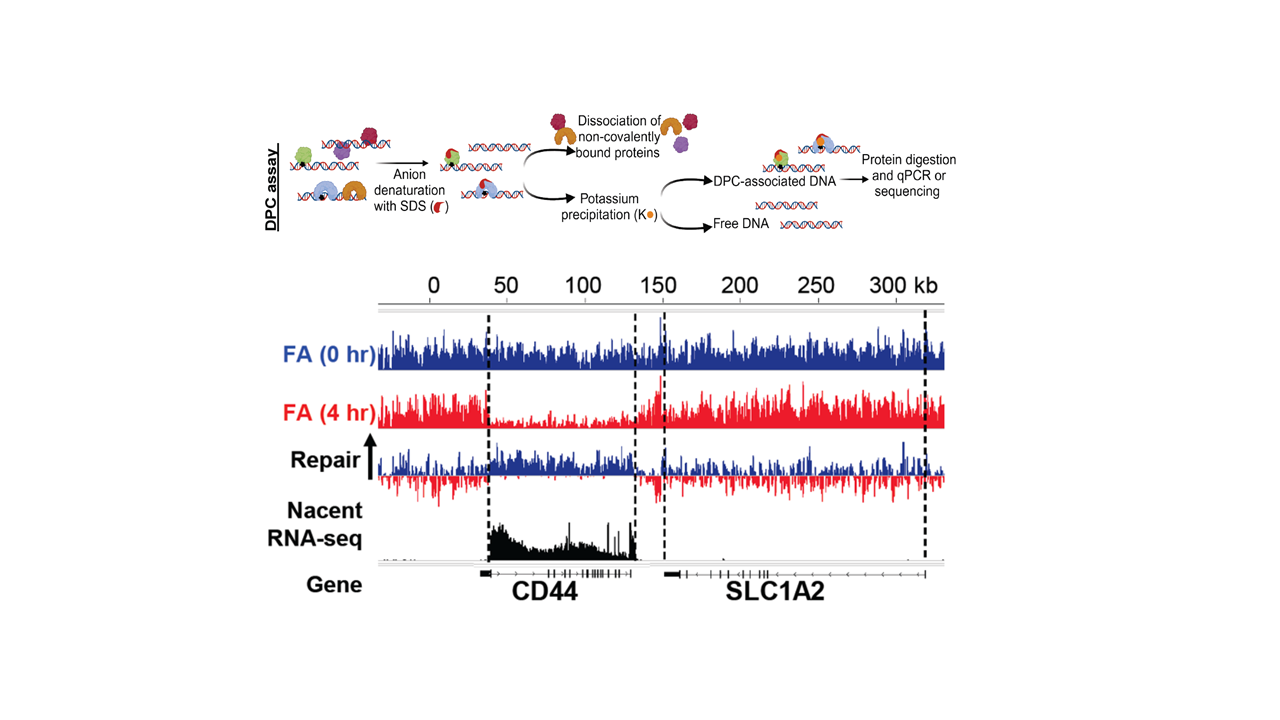 Figure: DNA protein crosslinks (DPCs) were sequenced directly (0 hr) and 4 hr after DPC induction. Transcription-coupled DPC repair is shown by loss of DPCs specifically in expressed genes (CD44) while no preferential repair is observed outside genes, or in non-expressed genes (SLC1A2).