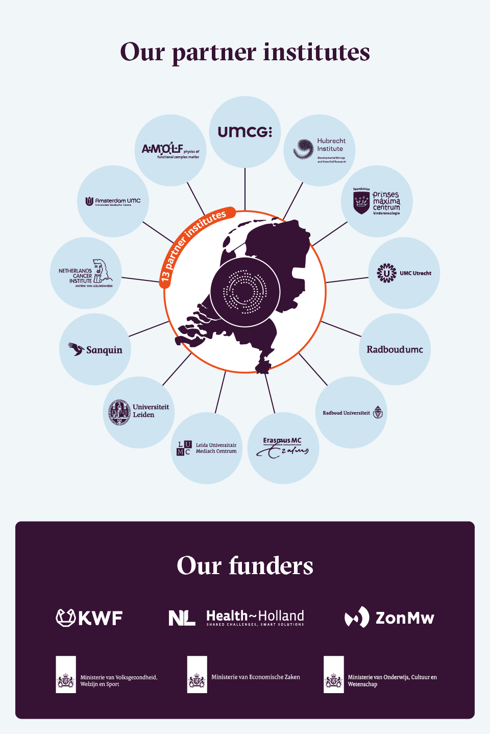 Funded by KWF Kankerbestrijding (KWF Dutch Cancer Society) and the Dutch Government, and in partnership with 13 research institutes across the Netherlands, we work closely with academic institutions, hospitals, patient representatives, biotech and pharmaceutical companies, technology developers, philanthropists and philanthropic organisations. Whether co-developing new tools, validating biomarkers or scaling therapeutic innovations, our partnerships are built on trust, transparency and a shared commitment to excellence.