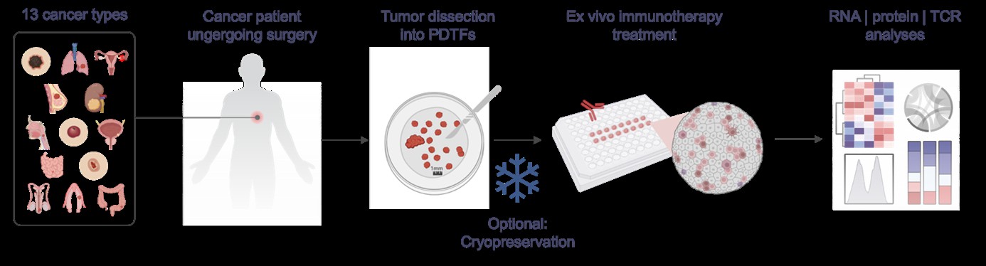 PDTFs can be established for multiple cancer types. The fragments maintain the patient-specific native tumor microenvironment including diverse cancer, immune, and stromal cell populations, as well as their spatial organization and functionality. The cultures can be combined with multiple readout technologies (e.g., flow cytometry, bulk/single cell RNA-sequencing, proteomics, secretomics, etc.), though some adaptation for low cell numbers might be needed. Cryopreservation of PDTFs is feasible, allowing to biobank material and validate or in-depth explore findings within specific tumor samples.